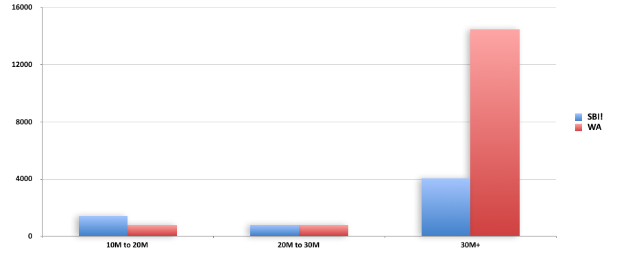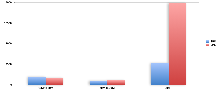 3) Outstanding: Look at the 40,000+ range (the "Outstanding" part of SEMrush results). SBI! has 106 sites in that range, while WA has none. This huge difference further suggests that SBI! has an additional degree of search traffic superiority.