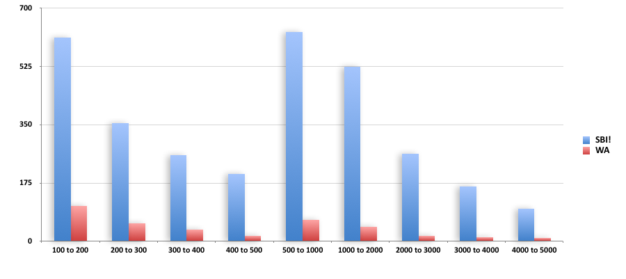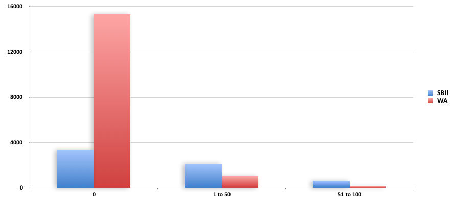 SBI! accounts for 90% (3103/3463) of the total of SBI! and Wealthy Affiliate sites in this range. Correcting for the 70% difference, the percentage increases to 94%.