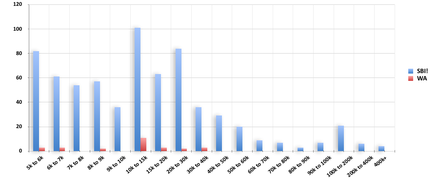 3) Outstanding: Now look at the 0 to 100K range. This is the "Outstanding" part of the Alexa Top 1M "Outstanding-Excellent" range. It's virtually unachievable for solopreneurs, almost the exclusive territory of larger businesses. SBI! has 25 sites here, while WA has 1.